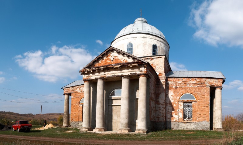 Правда, шел я сюда не ради приобщения к размеренному быту современного украинского села. Хотелось собственными глазами увидеть старую церковь, обнаруженную при составлении очередного маршрута в Google Earth (подборка фотографий из Panoramio здесь). Найти какую-либо информацию об этой церкви мне пока не удалось, поиски продолжаются. Судя по всему, здание построено в середине XIX века, вряд ли раньше. Сейчас его активно восстанавливают (чинят кладку и фронтоны, штукатурят), хотя выбор в пользу белых металлопластиковых окон выглядит довольно неоднозначным.